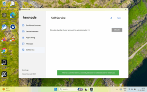 While the initial Self Service settings are configured by the administrator through the policies in the Hexnode UEM console, the user initiates the actual request for elevation of privileges. The process of elevation is started by the end-user directly on their Windows device using a locally installed Hexnode UEM application.