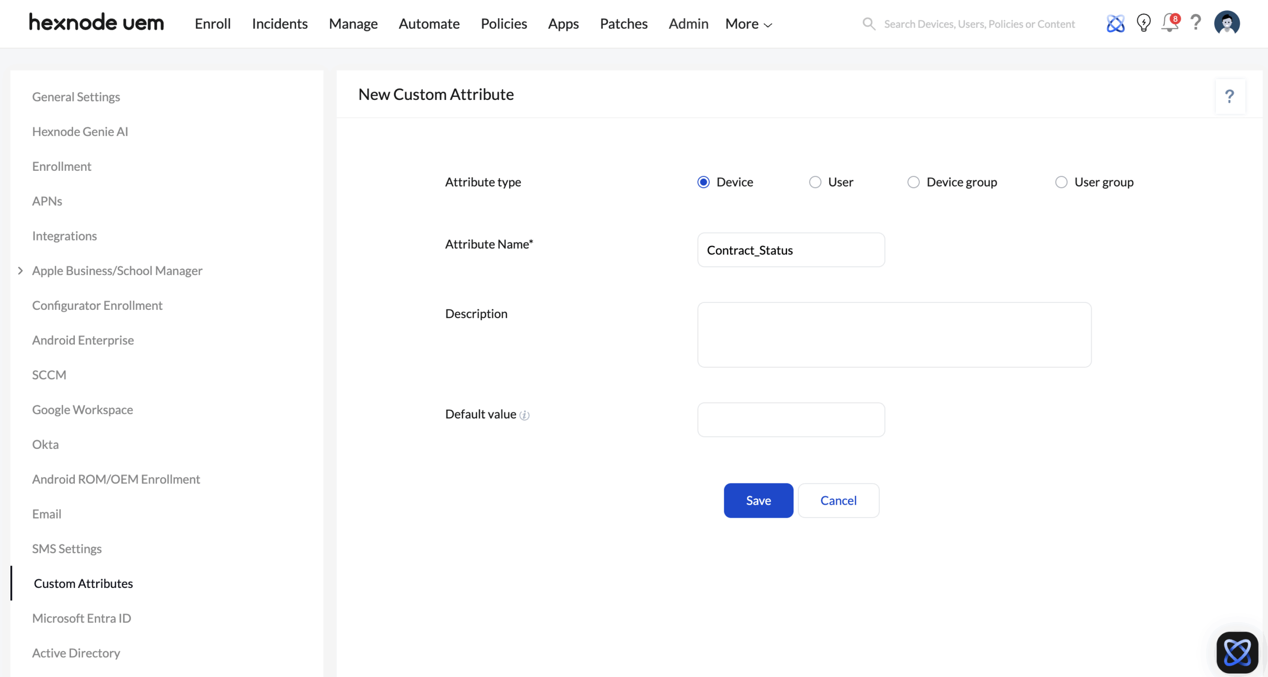 - Define the Tag: Go to Admin > Custom Attributes. Under New Attribute, set the Attribute Type to Device. Name the attribute Contract_Status and click Save.