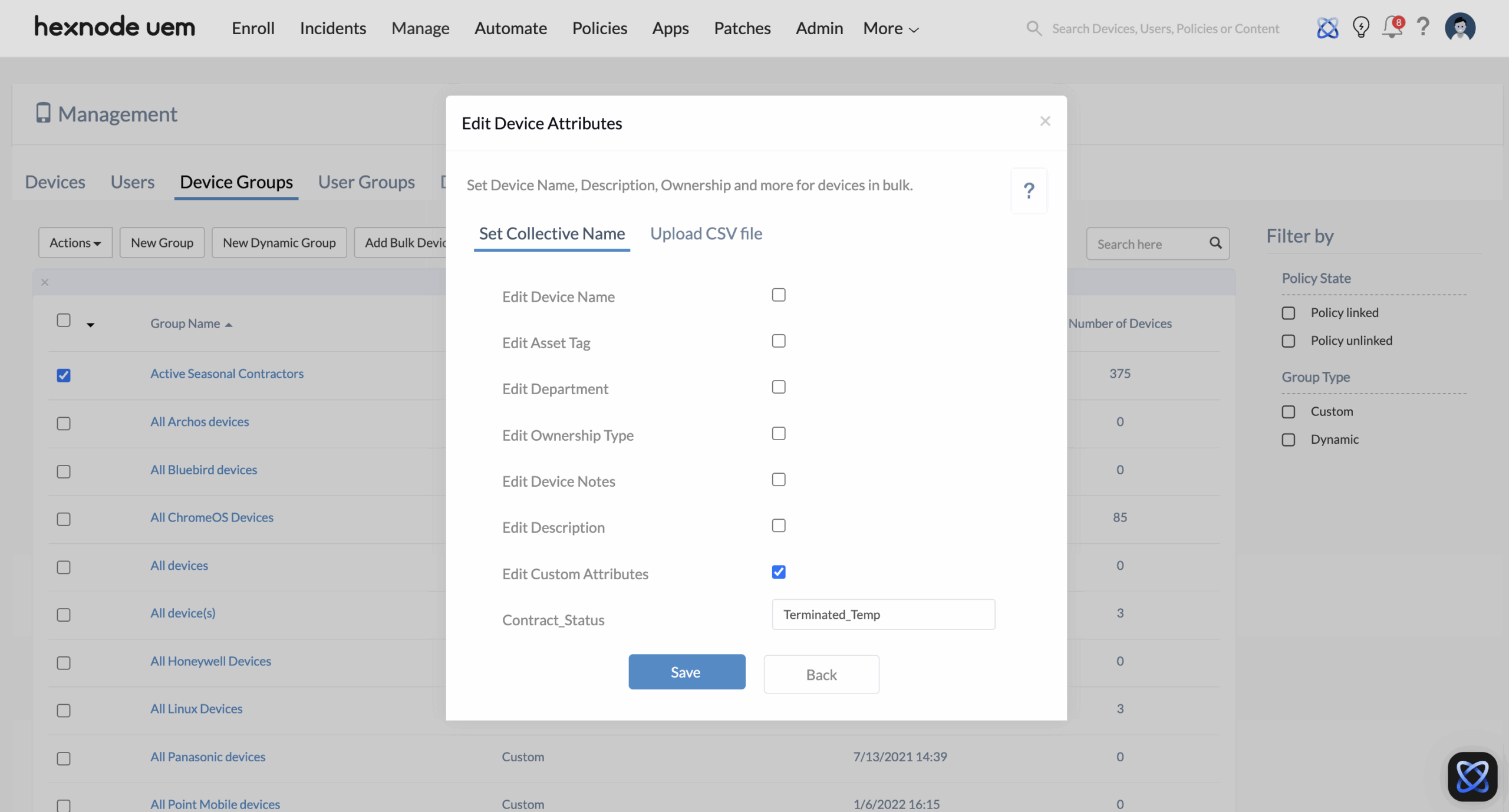 - Execution via Remote Action: Navigate to Manage > Device Groups and select your “Active Seasonal Contractors” dynamic group. From the top menu, click Actions > Edit > Edit Device Attributes. Check the Edit Custom Attributes box to reveal the available custom fields, change the Contract_Status value to Terminated_Temp, and click Save.