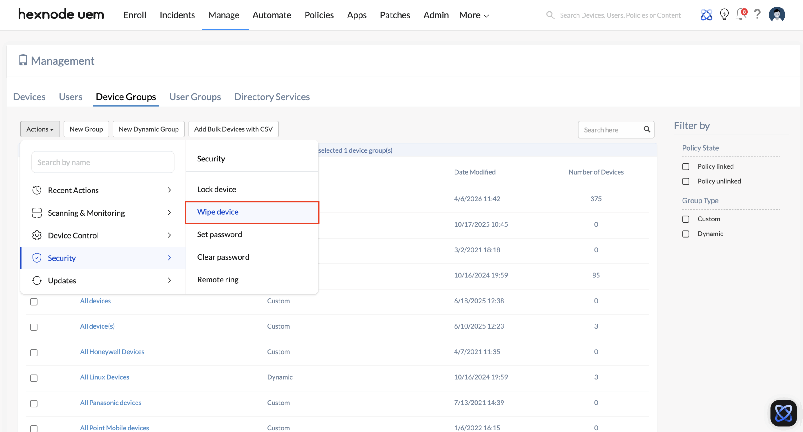 - The Bulk Wipe Action: Once the 500 devices automatically filter into the “Terminated Contractors” group, go to Manage > Device Groups, select the group, click Actions, and select Wipe Device. This sends an un-interruptible Complete Wipe command to the entire group at once, permanently erasing all data and returning the hardware to a factory state.