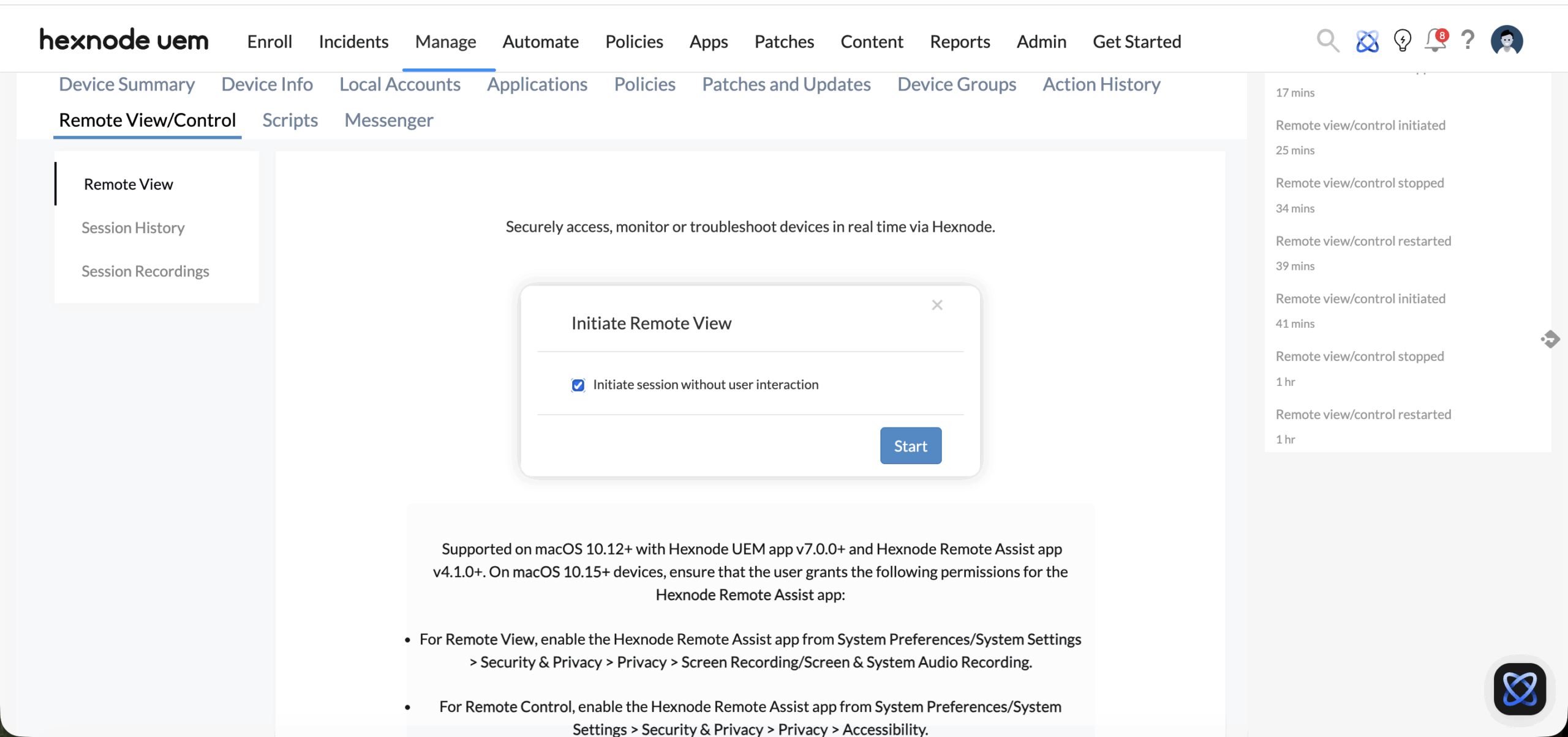 The Initiate session without user interaction option appears for the administrator within the Hexnode UEM portal. It is located inside the Initiate Remote View window that opens after clicking Start Session under the Remote View/Control tab of the specific device. This option is only visible if the Enable unattended remote access setting is toggled on in the Remote Access policy associated with the device. If this option is not selected during session initiation, the remote session will only begin if the user manually clicks Accept on the device end.
