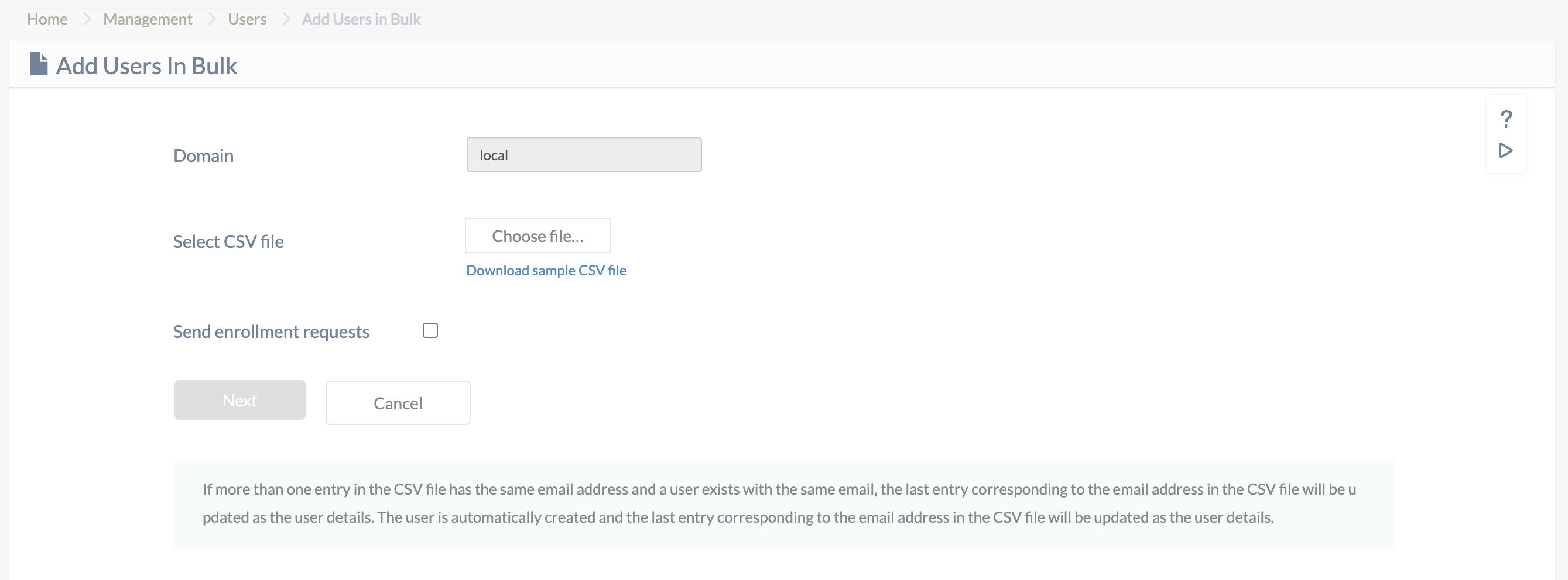 - Bulk User Import & Directory Sync: Hexnode natively supports mass user ingestion. Organizations can upload users via a mapped CSV file or establish a direct sync with modern directory services, including Microsoft Entra ID (Azure AD), Google Workspace, Okta, and Active Directory (AD). Note: Users synced via directory services maintain the IdP as their source of truth and cannot be manually edited or deleted locally within Hexnode.