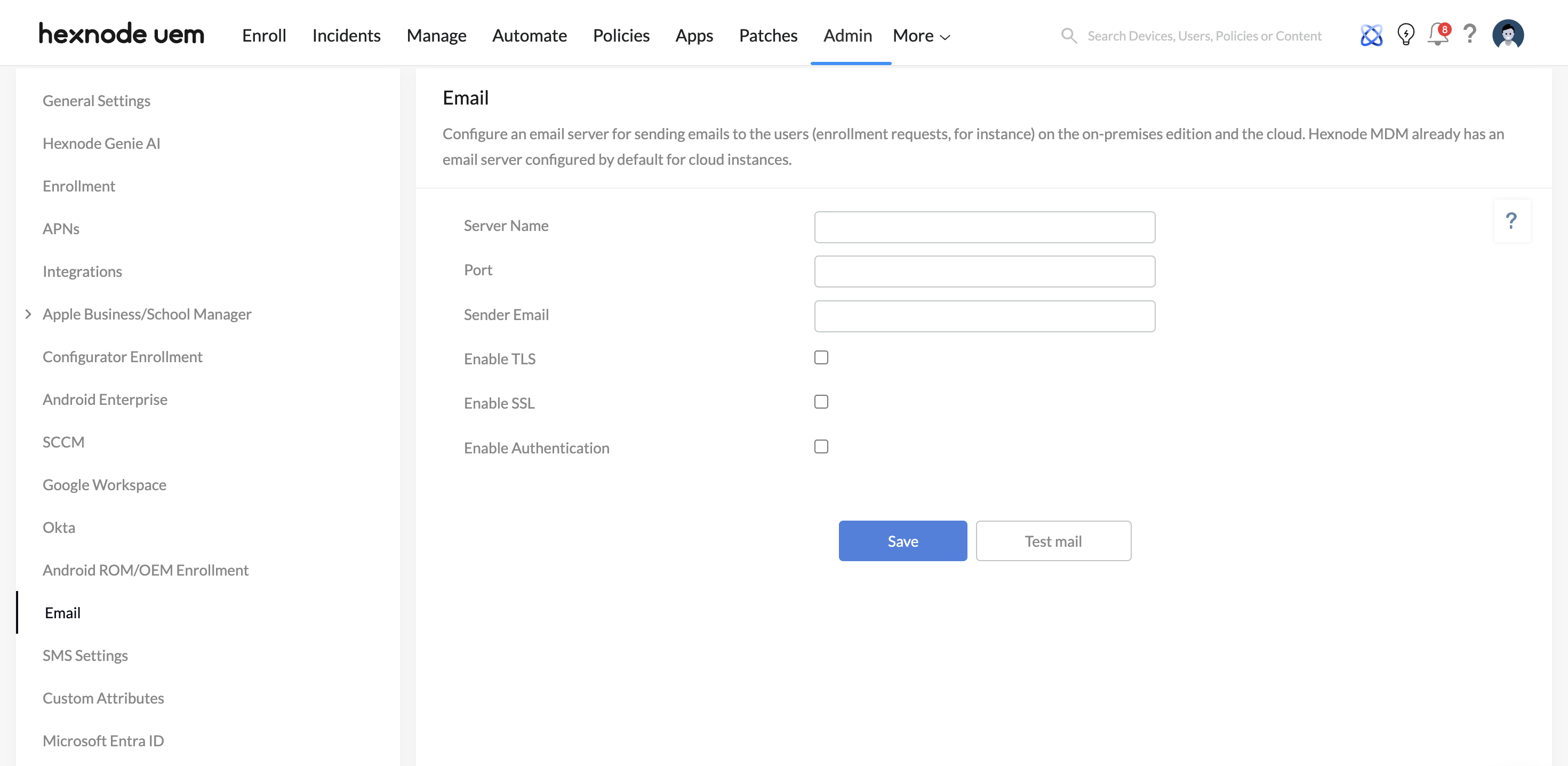 - Navigate to Admin > Email in the Hexnode console.