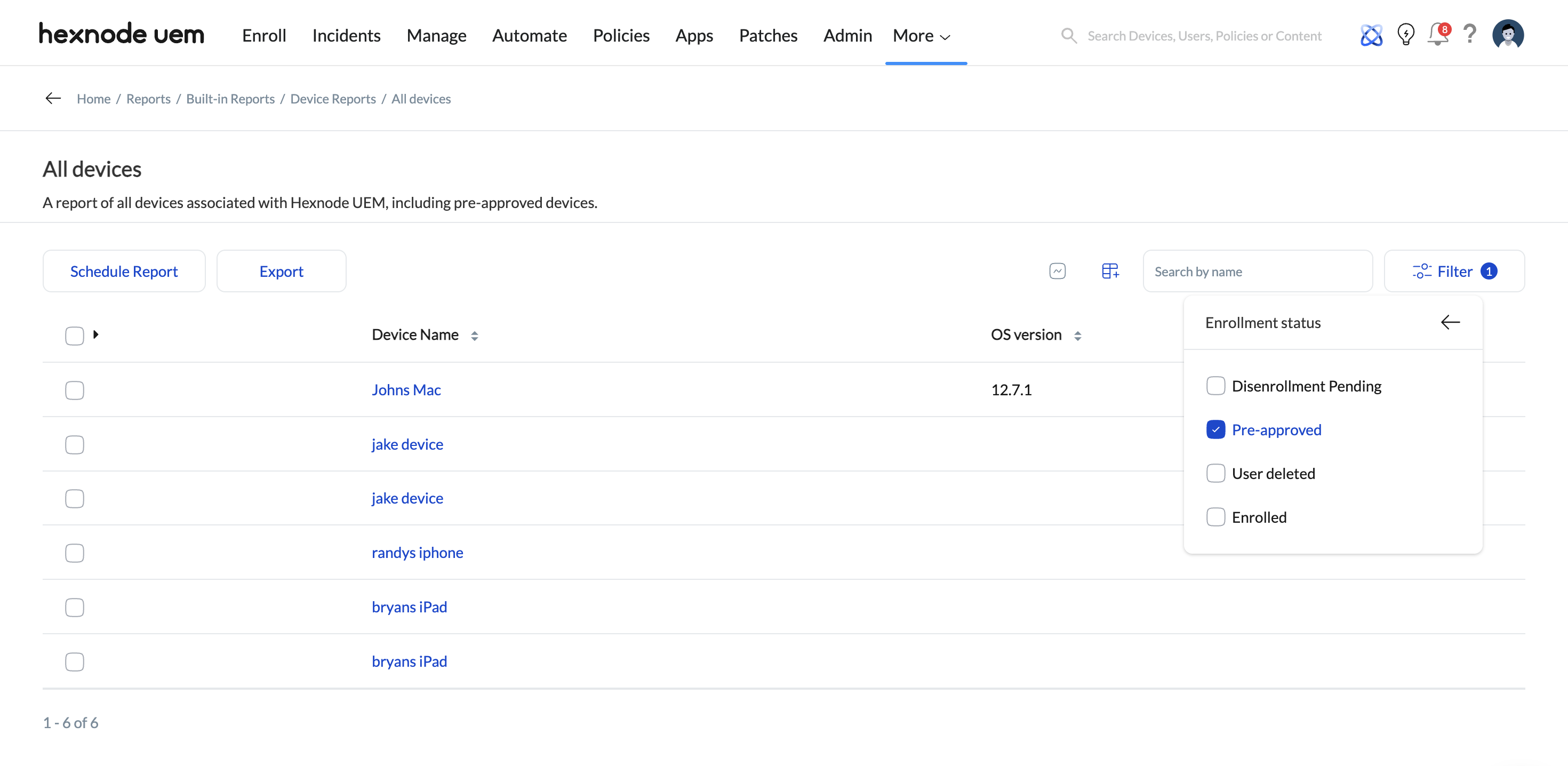 - To further enhance tracking progress, you can utilize Hexnode’s Reports (Reports > Built-in Reports > Device Reports > All Devices). Specifically, filtering by ‘Enrollment Status = Pre-approved’ allows you to filter for users who have ignored the initial email, enabling you to send a targeted “Final Reminder” blast only to that sub-group without bothering the already-enrolled users.