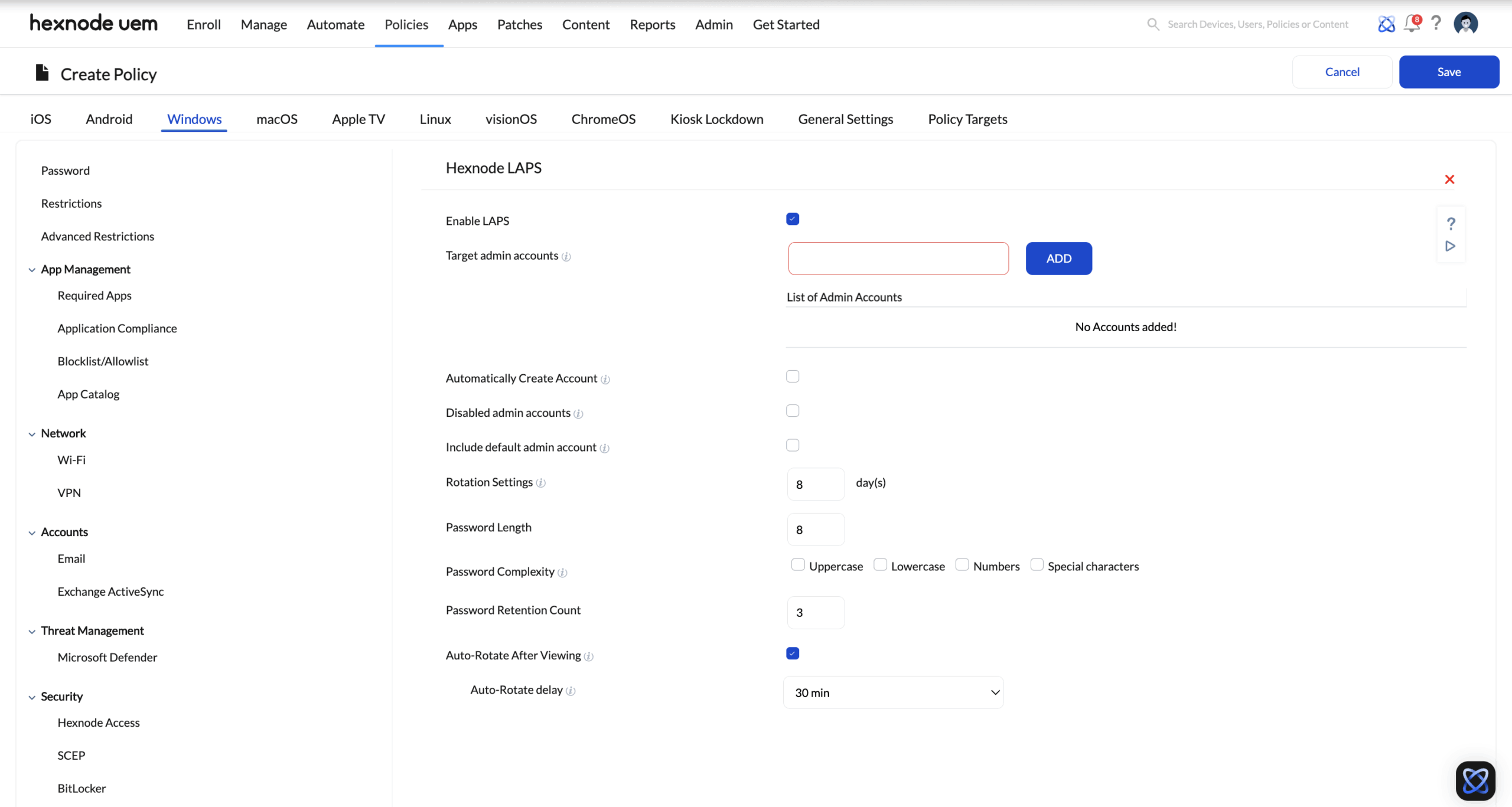 - Disabled Admin Accounts: When checked, Hexnode will enable disabled admin accounts and rotate their passwords. If left unchecked, disabled accounts will be ignored.
