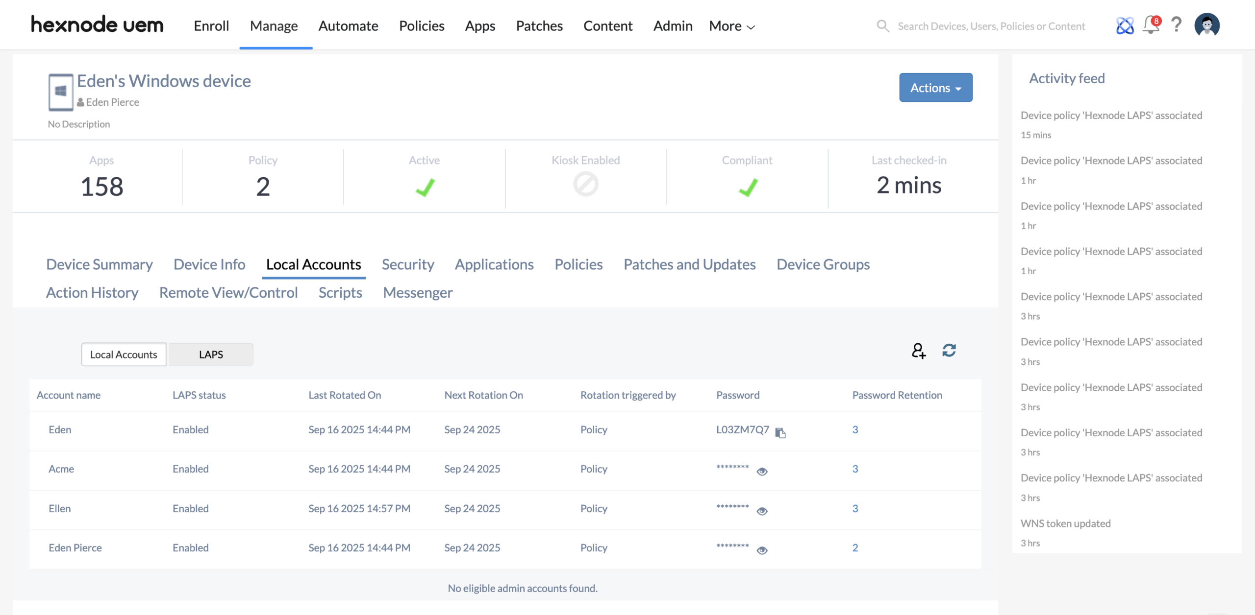 - Auto-Rotate After Viewing: IT admins can check the local administrator password for a device from Device Details page > Local Accounts > LAPS in the Hexnode UEM console. Put simply, viewing the password in the console triggers a rotation, ensuring that any exposed password is promptly replaced with a new one.