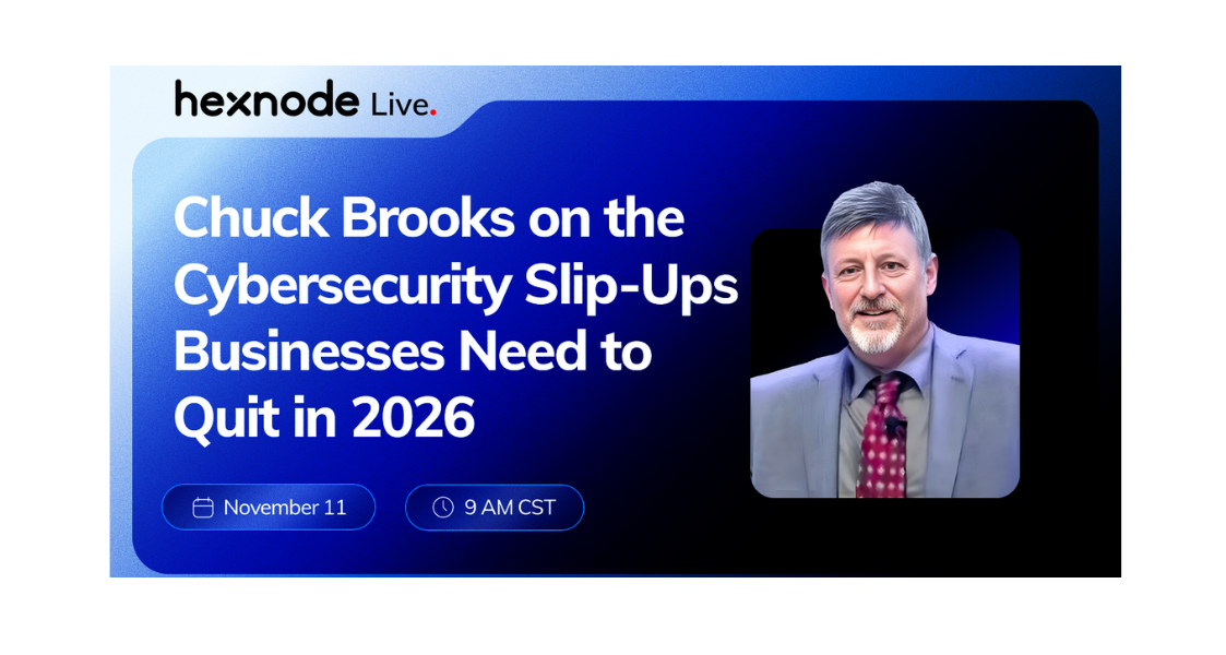 Watch the recent LinkedIn webinar hosted by Hexnode, where we featured Chuck Brooks, one of the most influential voices in cybersecurity. He shared powerful insights on why businesses still struggle with the security basics, what needs to change to build stronger workforce, more resilient defenses and much more.
