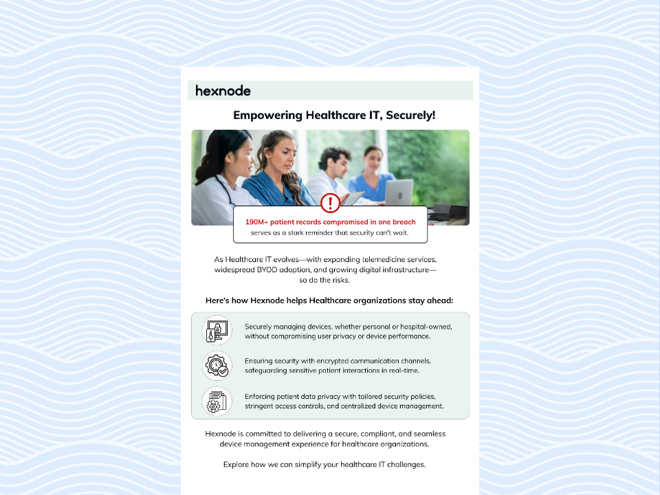 Hexnode delivers a secure, compliant, and efficient endpoint management solution for the healthcare industry. With advanced security features, device management, and seamless integration, Hexnode helps healthcare organizations streamline operations, protect sensitive data, and enhance patient care.